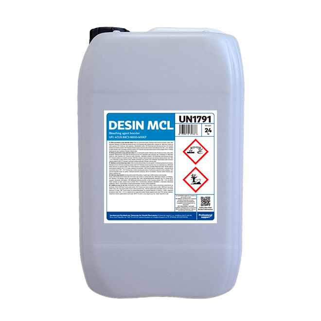 A DESIN MCL aktív klór alapú folyékony fehérítőszer a Professional support rendszerhez készült. Nehezen fehéríthető foltok (vér, paprika, gyümölcs, zöldség stb.) eltávolítására fejlesztették ki. Lehetővé teszi a higiénikus mosást, és hatékonyan eltávolítja a penészt a textíliákról. Alkalmas automatikus és kézi adagolásra, valamint minden típusú mosógéphez. Fehér és színtartó textíliák fehérítésére szolgál, kivéve a gyapjút, a poliamidot és a selymet. Gyorsan fellépő hatással. A hatóanyagok kiegyensúlyozott koncentrációja lehetővé teszi a biztonságos mosást. Elsősorban a Professional support rendszerhez fejlesztették ki, és főként ipari mosodák számára készült. A beállítást és a telepítést a Professional support technikusa végzi.