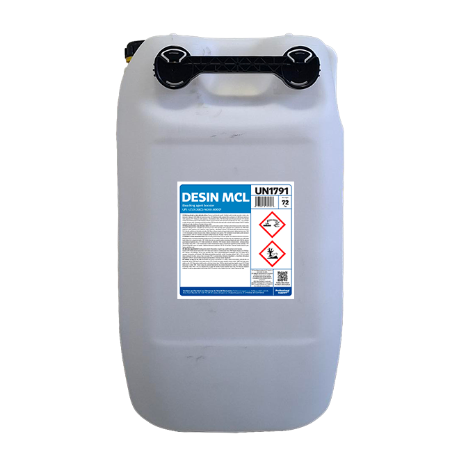 A DESIN MCL aktív klór alapú folyékony fehérítőszer a Professional support rendszerhez készült. Nehezen fehéríthető foltok (vér, paprika, gyümölcs, zöldség stb.) eltávolítására fejlesztették ki. Lehetővé teszi a higiénikus mosást, és hatékonyan eltávolítja a penészt a textíliákról. Alkalmas automatikus és kézi adagolásra, valamint minden típusú mosógéphez. Fehér és színtartó textíliák fehérítésére szolgál, kivéve a gyapjút, a poliamidot és a selymet. Gyorsan fellépő hatással. A hatóanyagok kiegyensúlyozott koncentrációja lehetővé teszi a biztonságos mosást. Elsősorban a Professional support rendszerhez fejlesztették ki, és főként ipari mosodák számára készült. A beállítást és a telepítést a Professional support technikusa végzi.