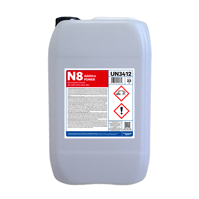 Az N8 POWER koncentrált, savas semlegesítőszer alkalmas minden típusú textíliához, és a Professional support rendszeréhez fejlesztették ki. Beállítja az öblítőfürdő pH-értékét. Eltávolítja a szerves szennyeződéseket, a mosószermaradványokat és a vízkövet a textíliákról és a mosógépből is. Megakadályozza a textíliák sárgulását és a bőrirritáció kialakulását. Gátolja a vízkő lerakódását a textíliákon, ezáltal meghosszabbítja azok élettartamát. Csökkenti más anyagok lerakódását a szálakban. Mérsékli a maradék lúgosságot és a textíliák vízkövesedését, ennek köszönhetően a textília puhábbá válik, és megszünteti a kellemetlen, dohos szagot. Az N8 POWER használatával a textíliák puhábbak és kellemes illatúak lesznek. Védi a szálakat, meghosszabbítja a mosott textíliák élettartamát, és javítja a mosási folyamat gazdaságosságát. Biológiailag lebomló összetevőket tartalmaz. Elsősorban a Professional support rendszerhez lett kifejlesztve, és főként ipari mosodák számára készült. A beállítást és a telepítést a Professional support technikusa végzi.